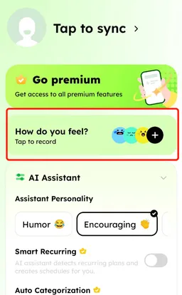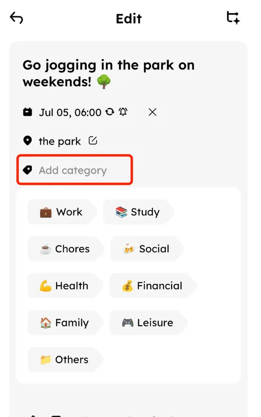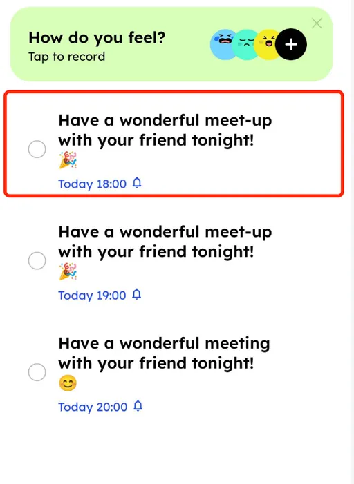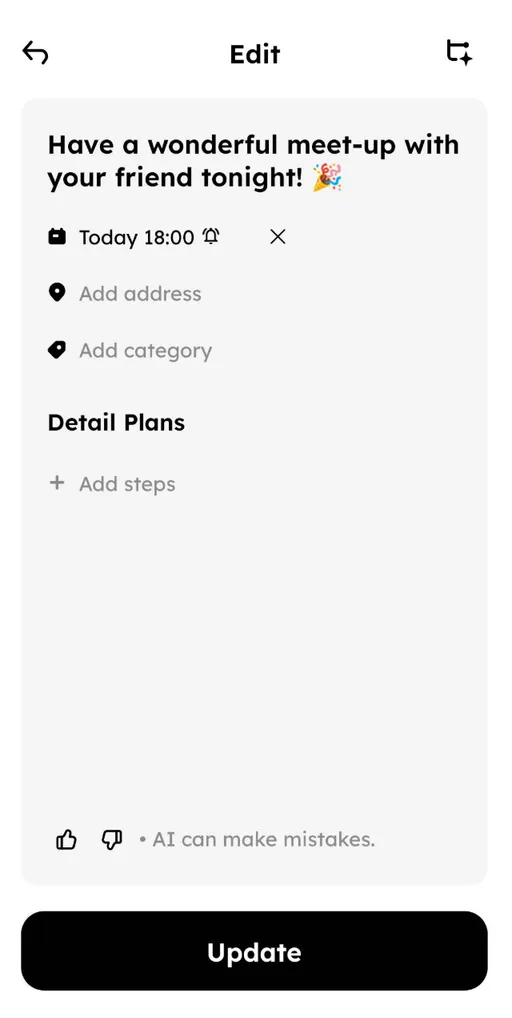 Tap the round floating button with a plus sign in the bottom right corner. The default interface will use smart AI to extract plans from your sentence and add them to your plan list. π§ The AI will automatically detect the content, location, date & time β no extra typing needed.